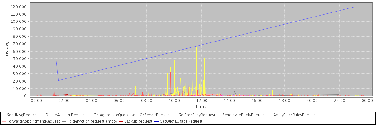 avg(SendMsgRequest) = 499.55 avg(DeleteAccountRequest) = 63837.33 avg(GetAggregateQuotaUsageOnServerRequest) = 1152.00 avg(GetFreeBusyRequest) = 1547.16 avg(SendInviteReplyRequest) = 397.89 avg(ApplyFilterRulesRequest) = 2047.50 avg(ForwardAppointmentRequest) = 839.33 avg(FolderActionRequest.empty) = 1434.69 avg(BackupRequest) = 1261.50 avg(GetQuotaUsageRequest) = 1424.00