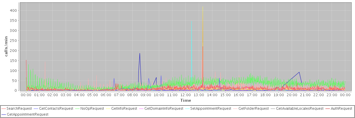 max(SearchRequest) = 221.00 max(GetContactsRequest) = 75.00 max(NoOpRequest) = 130.00 max(GetInfoRequest) = 420.00 max(GetDomainInfoRequest) = 210.00 max(SetAppointmentRequest) = 347.00 max(GetFolderRequest) = 239.00 max(GetAvailableLocalesRequest) = 209.00 max(AuthRequest) = 418.00 max(GetAppointmentRequest) = 186.00
