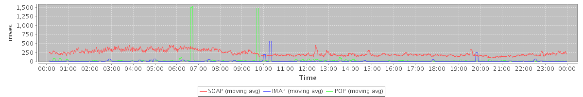 avg(SendInviteReplyRequest) = 367.60 avg(RemoveAttachmentsRequest) = 24960.00 avg(AutoCompleteRequest) = 145.32 avg(SendMsgRequest) = 689.47 avg(BackupQueryRequest) = 427.80 avg(GetAggregateQuotaUsageOnServerRequest) = 885.00 avg(GetFreeBusyRequest) = 159.98 avg(SaveDraftRequest) = 184.34 avg(GetQuotaUsageRequest) = 910.00 avg(AddMsgRequest) = 332.40