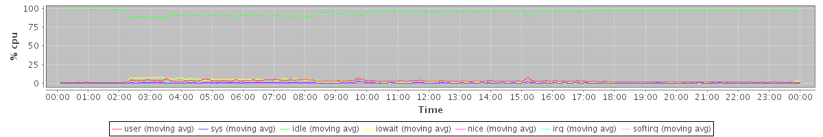 avg(user) = 2.76 avg(sys) = 0.49 avg(idle) = 94.75 avg(iowait) = 1.95 avg(nice) = 0.00 avg(irq) = 0.00 avg(softirq) = 0.04