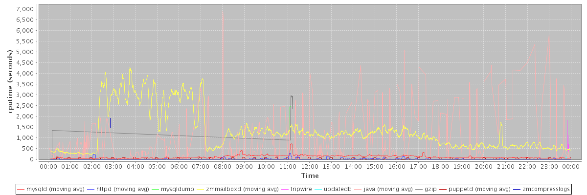 avg(mysqld) = 115.05 avg(httpd) = 17.12 avg(mysqldump) = 2188.25 avg(zmmailboxd) = 1311.65 avg(tripwire) = 864.22 avg(updatedb) = 56.75 avg(java) = 784.91 avg(gzip) = 2432.64 avg(puppetd) = 20.79 avg(zmcompresslogs) = 1697.00