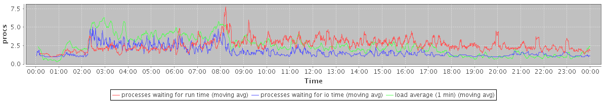 avg(processes waiting for run time) = 2.28 avg(processes waiting for io time) = 1.06 avg(load average (1 min)) = 2.46