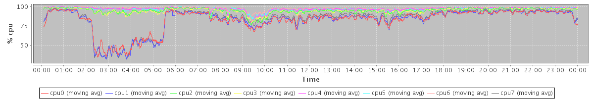 avg(cpu0) = 82.47 avg(cpu1) = 82.42 avg(cpu2) = 94.78 avg(cpu3) = 94.79 avg(cpu4) = 97.14 avg(cpu5) = 96.96 avg(cpu6) = 98.12 avg(cpu7) = 84.54