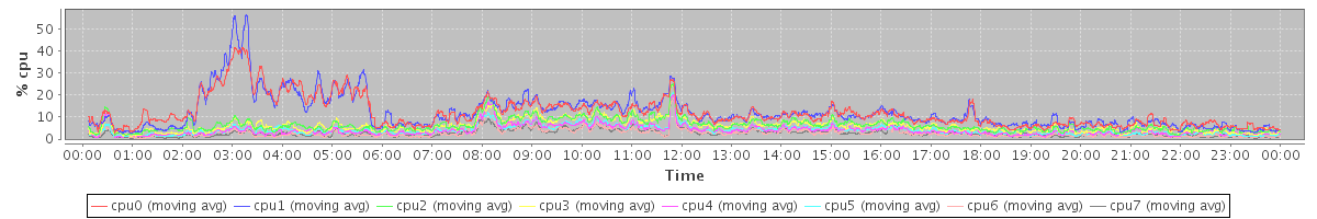 avg(cpu0) = 11.83 avg(cpu1) = 11.98 avg(cpu2) = 6.28 avg(cpu3) = 5.93 avg(cpu4) = 4.00 avg(cpu5) = 4.04 avg(cpu6) = 2.71 avg(cpu7) = 2.65
