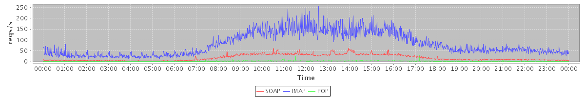 Host zm04.stanford.edu: Mailboxd: Request Rate by Client Protocol