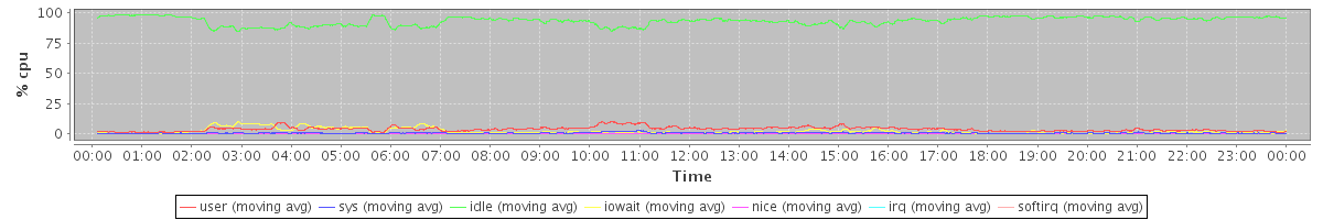 avg(user) = 3.78 avg(sys) = 0.60 avg(idle) = 93.47 avg(iowait) = 2.08 avg(nice) = 0.00 avg(irq) = 0.00 avg(softirq) = 0.08