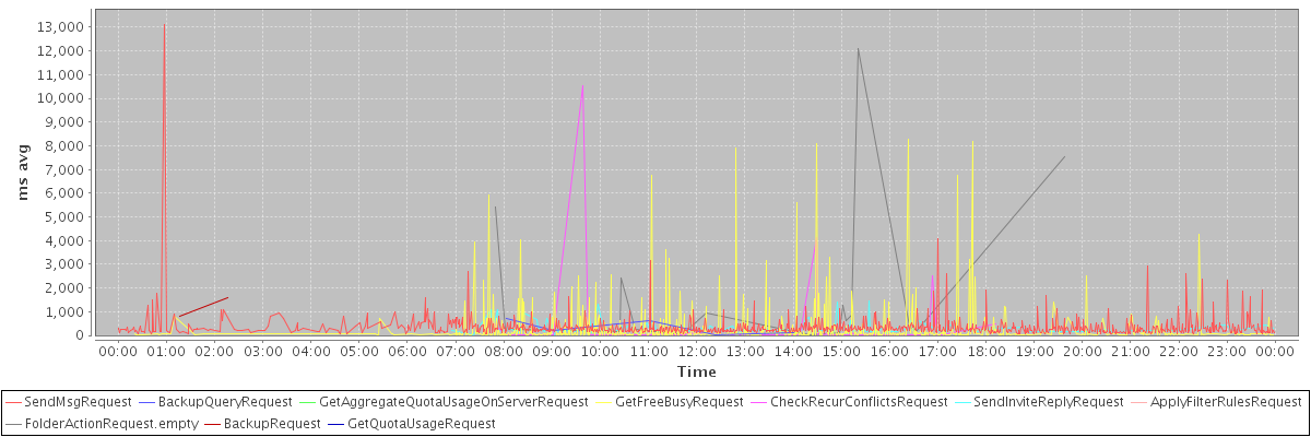 avg(SendMsgRequest) = 343.43 avg(BackupQueryRequest) = 335.80 avg(GetAggregateQuotaUsageOnServerRequest) = 1367.00 avg(GetFreeBusyRequest) = 297.15 avg(CheckRecurConflictsRequest) = 355.41 avg(SendInviteReplyRequest) = 295.00 avg(ApplyFilterRulesRequest) = 6037.00 avg(FolderActionRequest.empty) = 1742.47 avg(BackupRequest) = 1204.00 avg(GetQuotaUsageRequest) = 1563.00