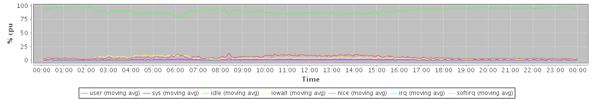 avg(user) = 5.18 avg(sys) = 0.66 avg(idle) = 90.84 avg(iowait) = 3.23 avg(nice) = 0.00 avg(irq) = 0.00 avg(softirq) = 0.09