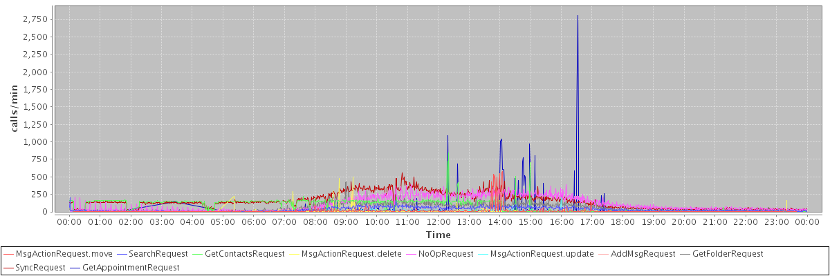 max(MsgActionRequest.move) = 574.00 max(SearchRequest) = 201.00 max(GetContactsRequest) = 839.00 max(MsgActionRequest.delete) = 501.00 max(NoOpRequest) = 391.00 max(MsgActionRequest.update) = 204.00 max(AddMsgRequest) = 289.00 max(GetFolderRequest) = 425.00 max(SyncRequest) = 553.00 max(GetAppointmentRequest) = 2807.00