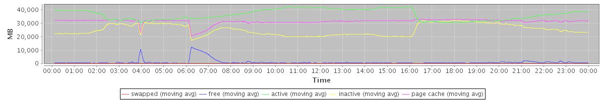 avg(swapped) = 3.66 avg(free) = 1016.94 avg(active) = 36498.48 avg(inactive) = 25166.64 avg(page cache) = 31383.86