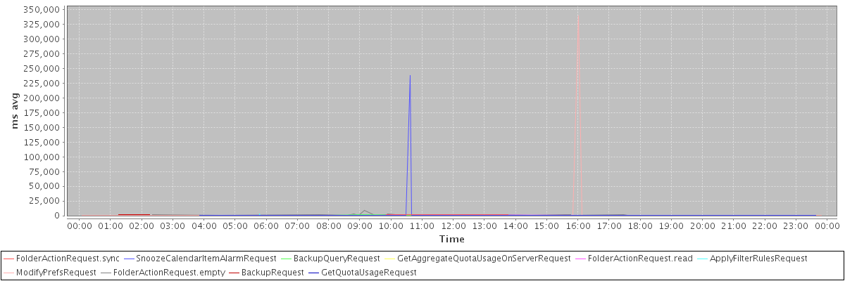 avg(FolderActionRequest.sync) = 2082.00 avg(SnoozeCalendarItemAlarmRequest) = 4804.16 avg(BackupQueryRequest) = 781.71 avg(GetAggregateQuotaUsageOnServerRequest) = 1261.00 avg(FolderActionRequest.read) = 1202.50 avg(ApplyFilterRulesRequest) = 871.40 avg(ModifyPrefsRequest) = 1473.58 avg(FolderActionRequest.empty) = 1149.72 avg(BackupRequest) = 1228.00 avg(GetQuotaUsageRequest) = 1419.00