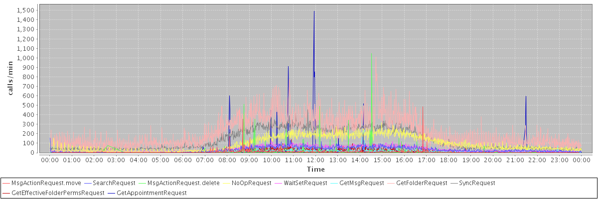 max(MsgActionRequest.move) = 483.00 max(SearchRequest) = 156.00 max(MsgActionRequest.delete) = 1048.00 max(NoOpRequest) = 316.00 max(WaitSetRequest) = 137.00 max(GetMsgRequest) = 239.00 max(GetFolderRequest) = 1010.00 max(SyncRequest) = 452.00 max(GetEffectiveFolderPermsRequest) = 137.00 max(GetAppointmentRequest) = 1493.00