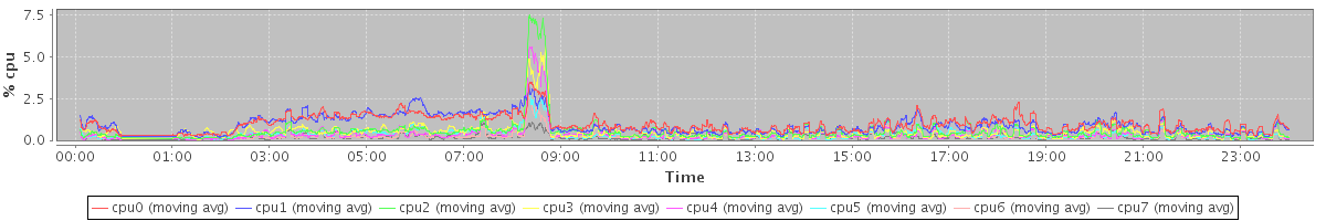 avg(cpu0) = 0.13 avg(cpu1) = 0.16 avg(cpu2) = 0.07 avg(cpu3) = 0.07 avg(cpu4) = 0.05 avg(cpu5) = 0.04 avg(cpu6) = 0.02 avg(cpu7) = 0.01