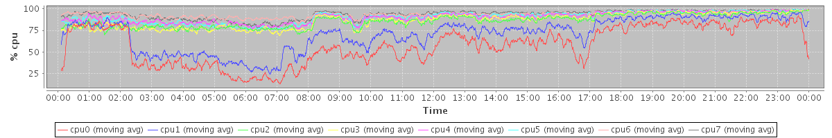 avg(cpu0) = 16.07 avg(cpu1) = 13.58 avg(cpu2) = 9.53 avg(cpu3) = 8.96 avg(cpu4) = 6.51 avg(cpu5) = 6.25 avg(cpu6) = 4.41 avg(cpu7) = 4.35