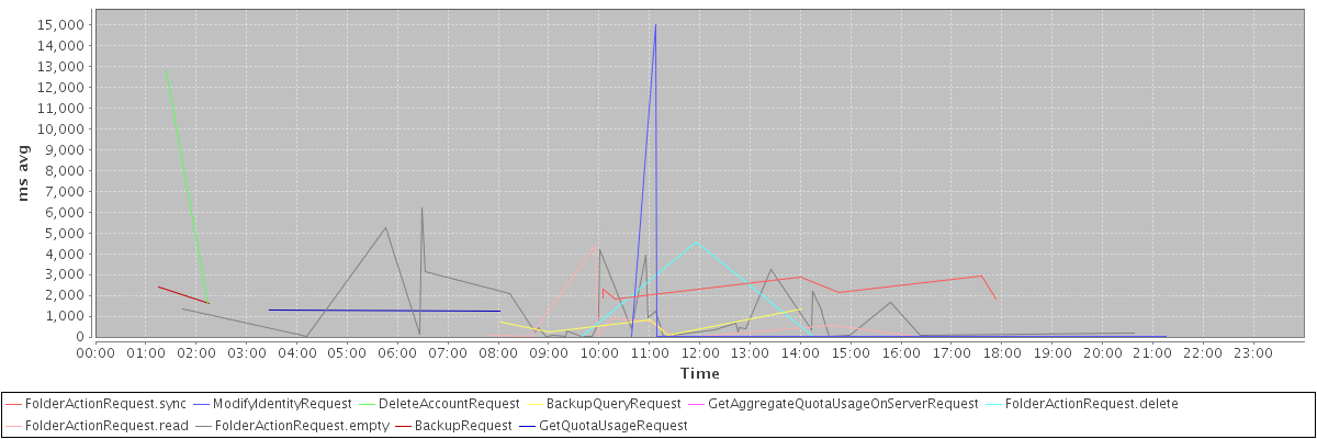 avg(FolderActionRequest.sync) = 2252.71 avg(ModifyIdentityRequest) = 1670.67 avg(DeleteAccountRequest) = 7162.50 avg(BackupQueryRequest) = 638.80 avg(GetAggregateQuotaUsageOnServerRequest) = 1157.00 avg(FolderActionRequest.delete) = 1545.00 avg(FolderActionRequest.read) = 639.67 avg(FolderActionRequest.empty) = 1128.18 avg(BackupRequest) = 2004.50 avg(GetQuotaUsageRequest) = 1263.00
