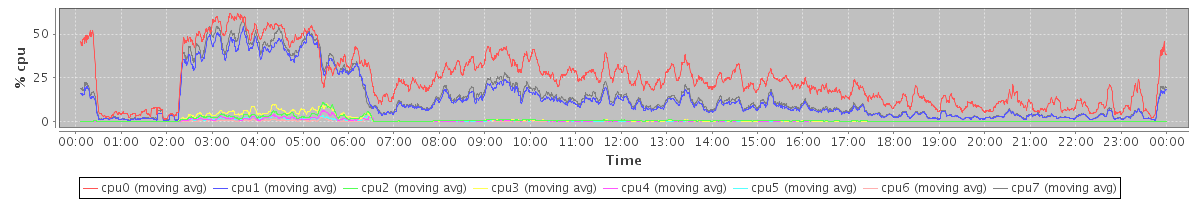 avg(cpu0) = 23.89 avg(cpu1) = 12.96 avg(cpu2) = 0.90 avg(cpu3) = 1.13 avg(cpu4) = 0.49 avg(cpu5) = 0.38 avg(cpu6) = 0.18 avg(cpu7) = 14.30