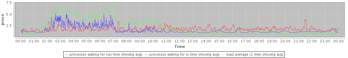 avg(processes waiting for run time) = 1.23 avg(processes waiting for io time) = 0.88 avg(load average (1 min)) = 2.26