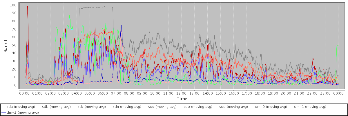 avg(sda) = 25.23 avg(sdb) = 14.89 avg(sdc) = 15.47 avg(sdn) = 25.25 avg(sdo) = 14.91 avg(sdp) = 15.48 avg(sdq) = 3.02 avg(dm-0) = 39.10 avg(dm-1) = 19.44 avg(dm-2) = 4.63