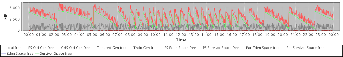 avg(total free) = 3394.86 avg(PS Old Gen free) = 0.00 avg(CMS Old Gen free) = 2550.12 avg(Tenured Gen free) = 0.00 avg(Train Gen free) = 0.00 avg(PS Eden Space free) = 0.00 avg(PS Survivor Space free) = 0.00 avg(Par Eden Space free) = 779.23 avg(Par Survivor Space free) = 65.51 avg(Eden Space free) = 0.00 avg(Survivor Space free) = 0.00