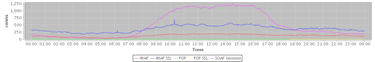 avg(IMAP) = 130.85 avg(IMAP SSL) = 367.60 avg(POP) = 0.02 avg(POP SSL) = 0.16 avg(SOAP sessions) = 499.94