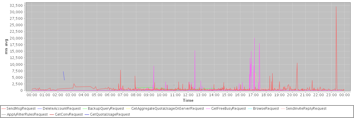 avg(SendMsgRequest) = 497.89 avg(DeleteAccountRequest) = 5864.67 avg(BackupQueryRequest) = 717.80 avg(GetAggregateQuotaUsageOnServerRequest) = 659.00 avg(GetFreeBusyRequest) = 339.33 avg(BrowseRequest) = 228.20 avg(SendInviteReplyRequest) = 454.62 avg(ApplyFilterRulesRequest) = 2052.00 avg(GetConvRequest) = 294.00 avg(GetQuotaUsageRequest) = 748.00