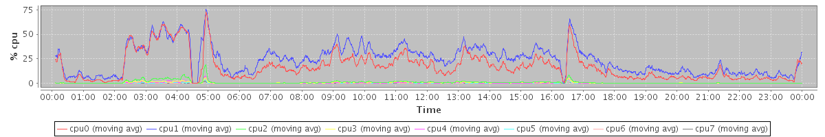 avg(cpu0) = 17.00 avg(cpu1) = 23.99 avg(cpu2) = 1.01 avg(cpu3) = 0.57 avg(cpu4) = 0.37 avg(cpu5) = 0.28 avg(cpu6) = 0.16 avg(cpu7) = 0.18