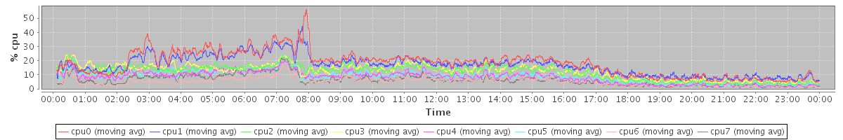 avg(cpu0) = 17.93 avg(cpu1) = 16.60 avg(cpu2) = 11.75 avg(cpu3) = 12.36 avg(cpu4) = 8.23 avg(cpu5) = 8.84 avg(cpu6) = 5.10 avg(cpu7) = 6.14