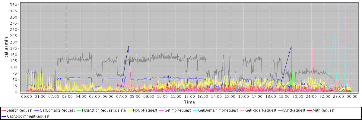 max(SearchRequest) = 87.00 max(GetContactsRequest) = 64.00 max(MsgActionRequest.delete) = 87.00 max(NoOpRequest) = 101.00 max(GetInfoRequest) = 64.00 max(GetDomainInfoRequest) = 342.00 max(GetFolderRequest) = 215.00 max(SyncRequest) = 164.00 max(AuthRequest) = 64.00 max(GetAppointmentRequest) = 184.00