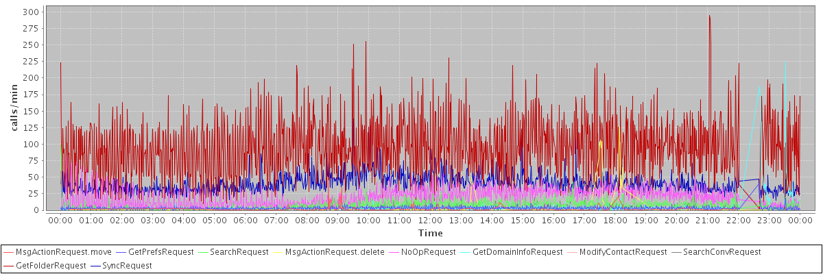 max(MsgActionRequest.move) = 48.00 max(GetPrefsRequest) = 40.00 max(SearchRequest) = 99.00 max(MsgActionRequest.delete) = 127.00 max(NoOpRequest) = 81.00 max(GetDomainInfoRequest) = 224.00 max(ModifyContactRequest) = 229.00 max(SearchConvRequest) = 44.00 max(GetFolderRequest) = 295.00 max(SyncRequest) = 138.00