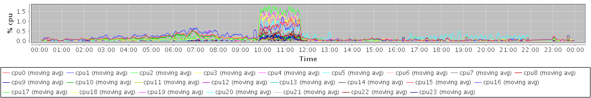 avg(cpu0) = 0.17 avg(cpu1) = 0.19 avg(cpu2) = 0.18 avg(cpu3) = 0.13 avg(cpu4) = 0.14 avg(cpu5) = 0.08 avg(cpu6) = 0.09 avg(cpu7) = 0.04 avg(cpu8) = 0.04 avg(cpu9) = 0.02 avg(cpu10) = 0.08 avg(cpu11) = 0.03 avg(cpu12) = 0.02 avg(cpu13) = 0.02 avg(cpu14) = 0.04 avg(cpu15) = 0.03 avg(cpu16) = 0.03 avg(cpu17) = 0.03 avg(cpu18) = 0.05 avg(cpu19) = 0.02 avg(cpu20) = 0.07 avg(cpu21) = 0.00 avg(cpu22) = 0.01 avg(cpu23) = 0.00