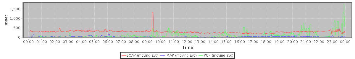 avg(SendMsgRequest) = 580.47 avg(DeleteAccountRequest) = 40383.50 avg(BackupQueryRequest) = 2540.60 avg(GetAggregateQuotaUsageOnServerRequest) = 4374.00 avg(SendInviteReplyRequest) = 527.89 avg(RemoveAttachmentsRequest) = 506.20 avg(FolderActionRequest.empty) = 750.20 avg(SendShareNotificationRequest) = 3367.00 avg(BackupRequest) = 1386.50 avg(GetQuotaUsageRequest) = 4766.00