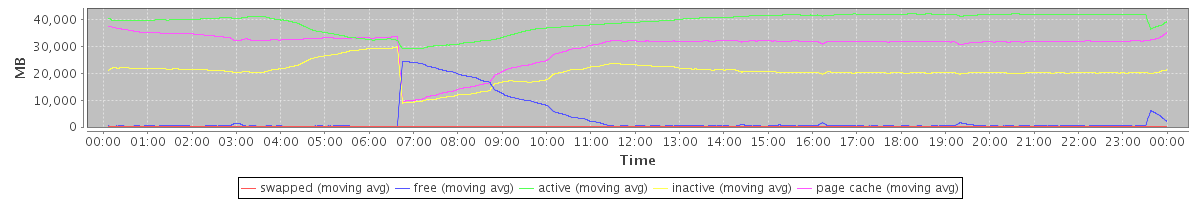 avg(swapped) = 10.77 avg(free) = 3003.66 avg(active) = 38864.53 avg(inactive) = 20477.26 avg(page cache) = 30112.36