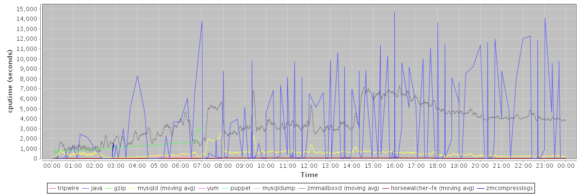 avg(tripwire) = 2168.00 avg(java) = 2087.58 avg(gzip) = 2659.35 avg(mysqld) = 510.95 avg(yum) = 75.00 avg(puppet) = 369.00 avg(mysqldump) = 168.52 avg(zmmailboxd) = 3614.97 avg(horsewatcher-fe) = 46.40 avg(zmcompresslogs) = 1024.12