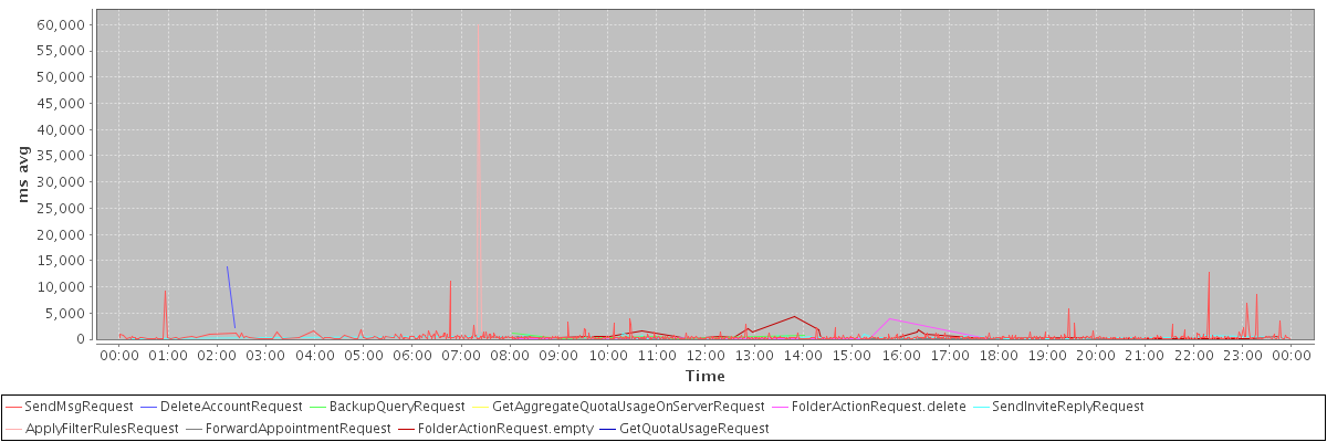 avg(SendMsgRequest) = 390.31 avg(DeleteAccountRequest) = 8087.00 avg(BackupQueryRequest) = 534.40 avg(GetAggregateQuotaUsageOnServerRequest) = 1074.00 avg(FolderActionRequest.delete) = 407.91 avg(SendInviteReplyRequest) = 295.17 avg(ApplyFilterRulesRequest) = 20974.67 avg(ForwardAppointmentRequest) = 300.17 avg(FolderActionRequest.empty) = 766.17 avg(GetQuotaUsageRequest) = 1149.00