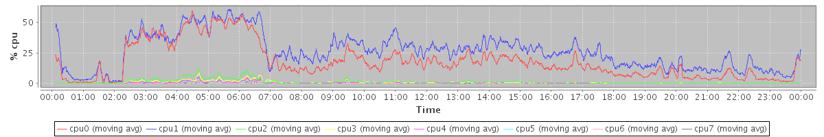 avg(cpu0) = 17.80 avg(cpu1) = 25.91 avg(cpu2) = 1.26 avg(cpu3) = 0.88 avg(cpu4) = 0.44 avg(cpu5) = 0.39 avg(cpu6) = 0.18 avg(cpu7) = 0.18