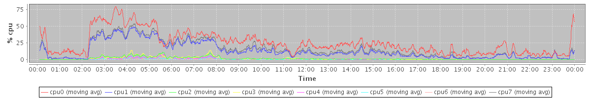 avg(cpu0) = 24.95 avg(cpu1) = 13.16 avg(cpu2) = 1.58 avg(cpu3) = 1.46 avg(cpu4) = 0.92 avg(cpu5) = 0.55 avg(cpu6) = 0.44 avg(cpu7) = 15.11