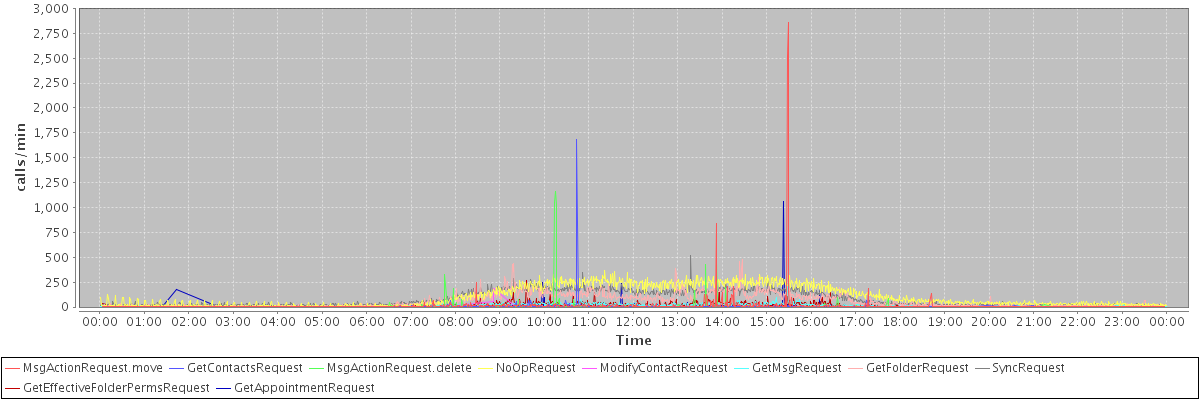 max(MsgActionRequest.move) = 2861.00 max(GetContactsRequest) = 1687.00 max(MsgActionRequest.delete) = 1165.00 max(NoOpRequest) = 366.00 max(ModifyContactRequest) = 185.00 max(GetMsgRequest) = 222.00 max(GetFolderRequest) = 478.00 max(SyncRequest) = 522.00 max(GetEffectiveFolderPermsRequest) = 269.00 max(GetAppointmentRequest) = 1060.00