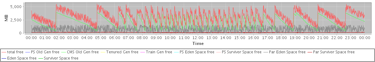 avg(total free) = 3106.86 avg(PS Old Gen free) = 0.00 avg(CMS Old Gen free) = 2174.99 avg(Tenured Gen free) = 0.00 avg(Train Gen free) = 0.00 avg(PS Eden Space free) = 0.00 avg(PS Survivor Space free) = 0.00 avg(Par Eden Space free) = 789.53 avg(Par Survivor Space free) = 142.33 avg(Eden Space free) = 0.00 avg(Survivor Space free) = 0.00