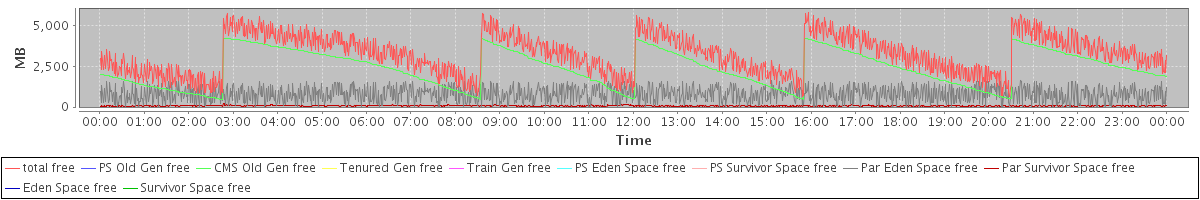 avg(total free) = 3244.50 avg(PS Old Gen free) = 0.00 avg(CMS Old Gen free) = 2384.44 avg(Tenured Gen free) = 0.00 avg(Train Gen free) = 0.00 avg(PS Eden Space free) = 0.00 avg(PS Survivor Space free) = 0.00 avg(Par Eden Space free) = 790.02 avg(Par Survivor Space free) = 70.03 avg(Eden Space free) = 0.00 avg(Survivor Space free) = 0.00