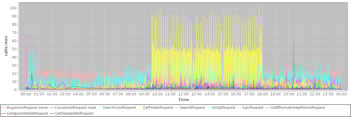 max(MsgActionRequest.move) = 22.00 max(ConvActionRequest.read) = 20.00 max(SearchConvRequest) = 26.00 max(GetFolderRequest) = 102.00 max(SearchRequest) = 66.00 max(NoOpRequest) = 50.00 max(SyncRequest) = 36.00 max(GetEffectiveFolderPermsRequest) = 60.00 max(GetAppointmentRequest) = 18.00 max(GetDomainInfoRequest) = 22.00