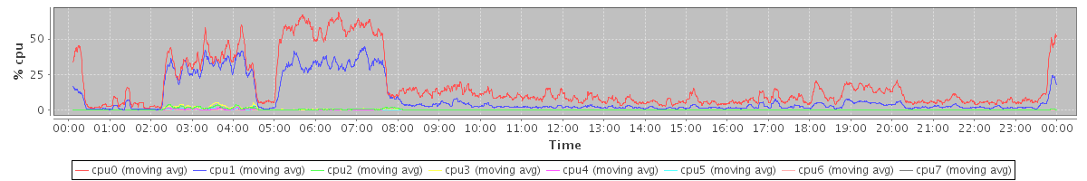 avg(cpu0) = 17.29 avg(cpu1) = 8.82 avg(cpu2) = 0.32 avg(cpu3) = 0.34 avg(cpu4) = 0.13 avg(cpu5) = 0.11 avg(cpu6) = 0.08 avg(cpu7) = 0.09