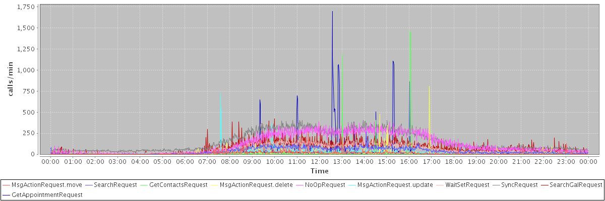 max(MsgActionRequest.move) = 270.00 max(SearchRequest) = 267.00 max(GetContactsRequest) = 1459.00 max(MsgActionRequest.delete) = 809.00 max(NoOpRequest) = 390.00 max(MsgActionRequest.update) = 725.00 max(WaitSetRequest) = 207.00 max(SyncRequest) = 405.00 max(SearchGalRequest) = 420.00 max(GetAppointmentRequest) = 1697.00
