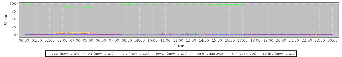 avg(user) = 2.11 avg(sys) = 0.33 avg(idle) = 96.24 avg(iowait) = 1.28 avg(nice) = 0.00 avg(irq) = 0.00 avg(softirq) = 0.01