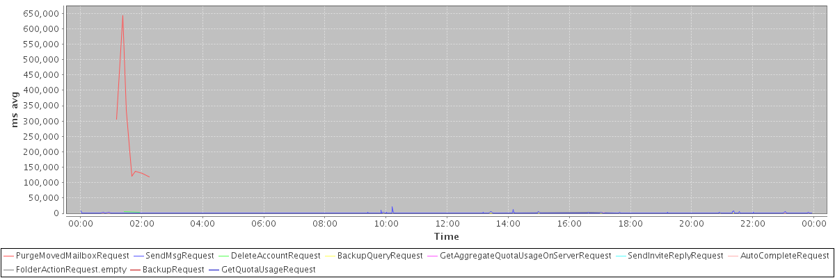 avg(PurgeMovedMailboxRequest) = 255406.71 avg(SendMsgRequest) = 632.23 avg(DeleteAccountRequest) = 4600.50 avg(BackupQueryRequest) = 597.20 avg(GetAggregateQuotaUsageOnServerRequest) = 1462.00 avg(SendInviteReplyRequest) = 428.73 avg(AutoCompleteRequest) = 249.18 avg(FolderActionRequest.empty) = 1321.60 avg(BackupRequest) = 1509.00 avg(GetQuotaUsageRequest) = 1786.00