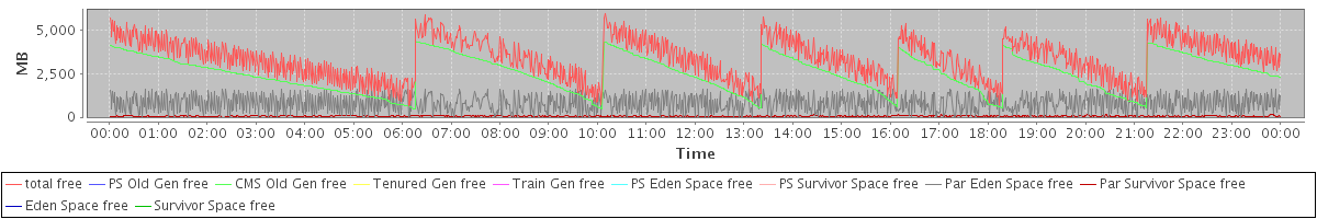 avg(total free) = 3365.31 avg(PS Old Gen free) = 0.00 avg(CMS Old Gen free) = 2506.43 avg(Tenured Gen free) = 0.00 avg(Train Gen free) = 0.00 avg(PS Eden Space free) = 0.00 avg(PS Survivor Space free) = 0.00 avg(Par Eden Space free) = 801.65 avg(Par Survivor Space free) = 57.23 avg(Eden Space free) = 0.00 avg(Survivor Space free) = 0.00