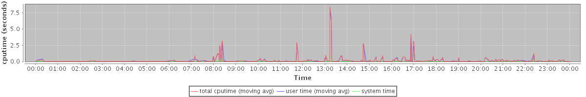 avg(mysqld) = 74.25 avg(mysqldump) = 2032.67 avg(zmmailboxd) = 1431.10 avg(tripwire) = 893.33 avg(updatedb) = 51.10 avg(java) = 831.21 avg(rpm) = 18.88 avg(gzip) = 2634.14 avg(puppetd) = 22.08 avg(zmcompresslogs) = 1337.00