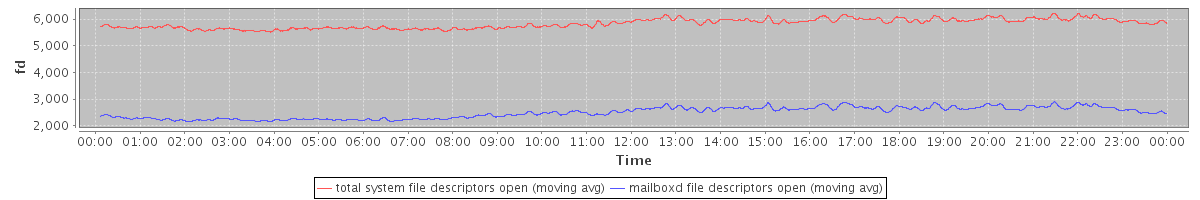 avg(total system file descriptors open) = 5824.21 avg(mailboxd file descriptors open) = 2488.17