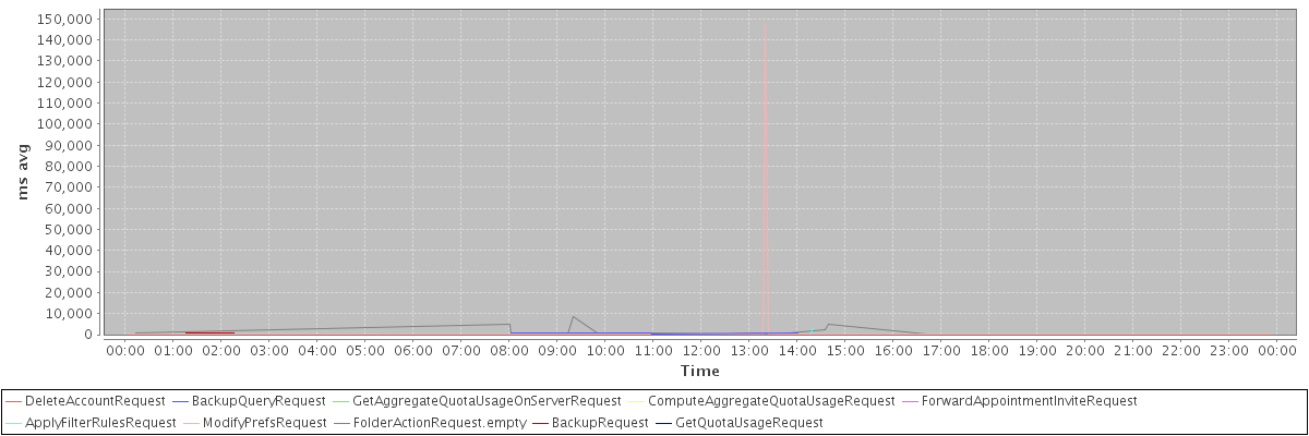 avg(DeleteAccountRequest) = 15979.00 avg(BackupQueryRequest) = 451.43 avg(GetAggregateQuotaUsageOnServerRequest) = 1110.00 avg(ComputeAggregateQuotaUsageRequest) = 1866.00 avg(ForwardAppointmentInviteRequest) = 534.00 avg(ApplyFilterRulesRequest) = 2126.00 avg(ModifyPrefsRequest) = 441.24 avg(FolderActionRequest.empty) = 1329.19 avg(BackupRequest) = 922.00 avg(GetQuotaUsageRequest) = 1206.00