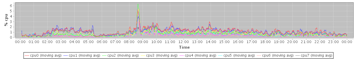 avg(cpu0) = 0.19 avg(cpu1) = 0.17 avg(cpu2) = 0.10 avg(cpu3) = 0.09 avg(cpu4) = 0.06 avg(cpu5) = 0.07 avg(cpu6) = 0.03 avg(cpu7) = 0.08