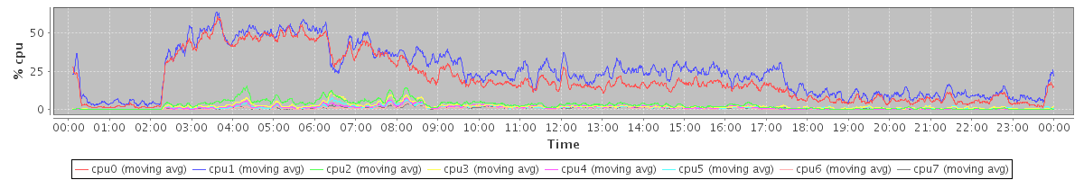 avg(cpu0) = 19.40 avg(cpu1) = 24.35 avg(cpu2) = 2.81 avg(cpu3) = 1.98 avg(cpu4) = 1.23 avg(cpu5) = 1.31 avg(cpu6) = 0.63 avg(cpu7) = 0.67